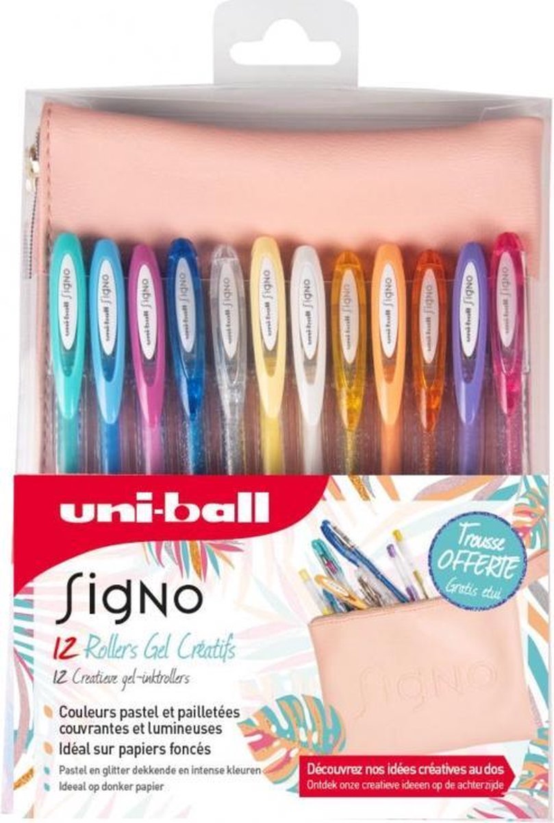 Signo gel pen set 12 stuks + gratis etui 12 pastel en glitterkleuren, ideaal op donker papier Pastel: wit, geel, groen, violet, roze, blauw en oranje Glitter: zilver, roze, oranje, blauw en goud De Signo gelpen is perfect voor het toevoegen van kleur aan je notities thuis, op je werk of op school. De pennen zijn gevuld met Uni Super Inkt, een sneldrogende gel inkt die watervast is en niet vervaagt. Met een breed kleurengamma van dekkende kleuren is de Signo gel pen ook ideaal voor creatieve toepassingen. Gebruik hem bijvoorbeeld voor scrapbooking, kaarten maken en kleuren. Hij verrast je vooral op een donkere achtergrond! De pennen zijn doorzichtig zodat je precies ziet hoeveel inkt er nog in de pen zit. Aan de dop zie je duidelijk met welke kleur je werkt. De Signo gelpen heeft een 1 mm punt.