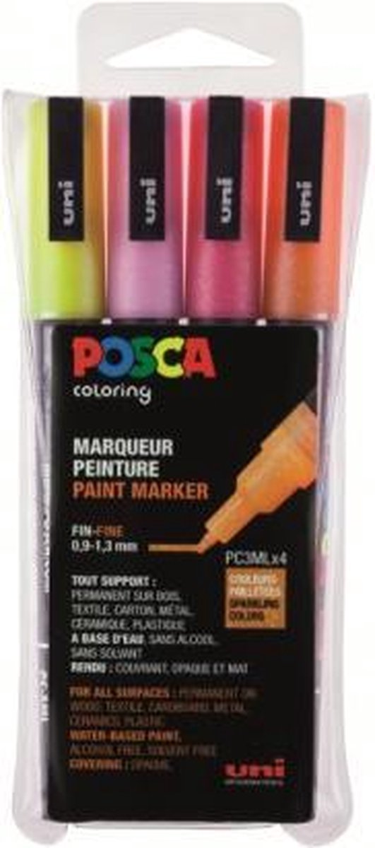 Het lijkt op acrylverf, is dekkend en ondoorschijnend. Zonder alcohol en oplosmiddel, reukloos, sneldrogend en trekt niet in het papier. Het is verwijderbaar van een gladde ondergrond zoals glas. Deze set bevat 4 stiften in de glitterkleuren; geel, roze, rood en oranje.