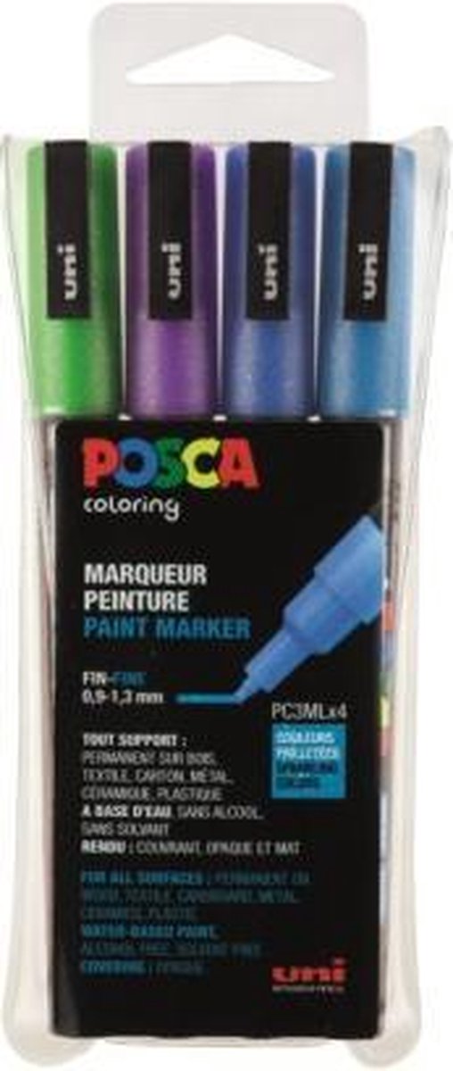 Het lijkt op acrylverf, is dekkend en ondoorschijnend. Zonder alcohol en oplosmiddel, reukloos, sneldrogend en trekt niet in het papier. Het is verwijderbaar van een gladde ondergrond zoals glas. Deze set bevat 4 stiften in de glitterkleuren; lichtblauw, donkerblauw, paars en donkergroen.