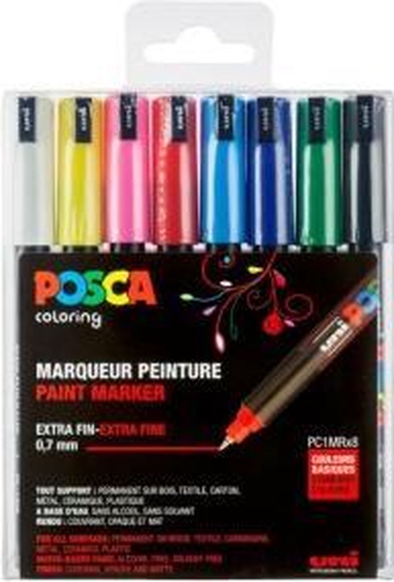 Posca set van 8 x PC1MR markers. Standaardkleuren geschikt voor de meeste toepassingen. Permanent op hout, textiel, karton, metaal, keramiek en plastic. Uitwisbaar op gladde oppervlakken zoals glas. Op metaal, plastic en geglazuurd aardewerk moet de creatie gefixeerd worden met een fixatielak. Kenmerken – Dikte: 0,7 mm – Op waterbasis – Bevat geen alcohol of oplosmiddelen – Dekkend, ondoorzichtig en mat Deze set bevat de volgende kleuren: Lichtblauw – donkerblauw – rood – rose – geel – wit – zwart – donkergroen