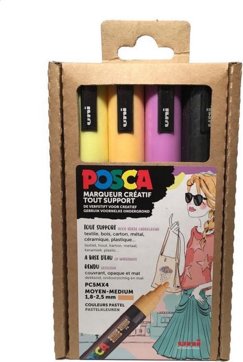 Het lijkt op acrylverf, is dekkend en ondoorschijnend. Zonder alcohol en oplosmiddel, reukloos, sneldrogend en trekt niet in het papier. Het is verwijderbaar van een gladde ondergrond zoals glas. Posca set PC5Mx4 medium pastelkleuren warm Zwart – lavendel – abrikoos – zonnegeel Dikte: 1,8 – 2,5 mm