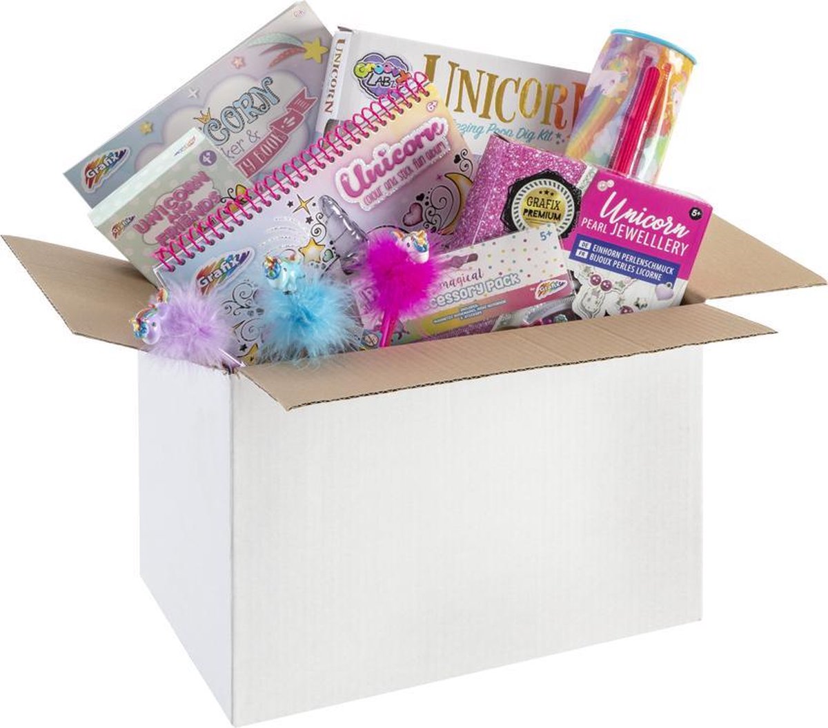 Enorm leuke unicorn set. In deze doos zitten allerlei unicorn artikelen om mee te knutselen en spelen! Inhoud van Unicorn doos: - Unicorn kwartet 8715427052809 - Unicorn Fizzing Dig & Jewellery Making Kit R03-0636C12 - UNICORN COLOUR & STICK FUN R03-0825C24 - PY PVC Pencil Case R04-0074C48 - Pony Fluffy Pens R04-0102/GE - PY Accessory set R04-0069C96 - Unicorn Activity & Sticker Book R04-0128C48 - Unicorn Pearl Jewellery GP-UPJ Heel veel plezier met deze uitgebreide box!