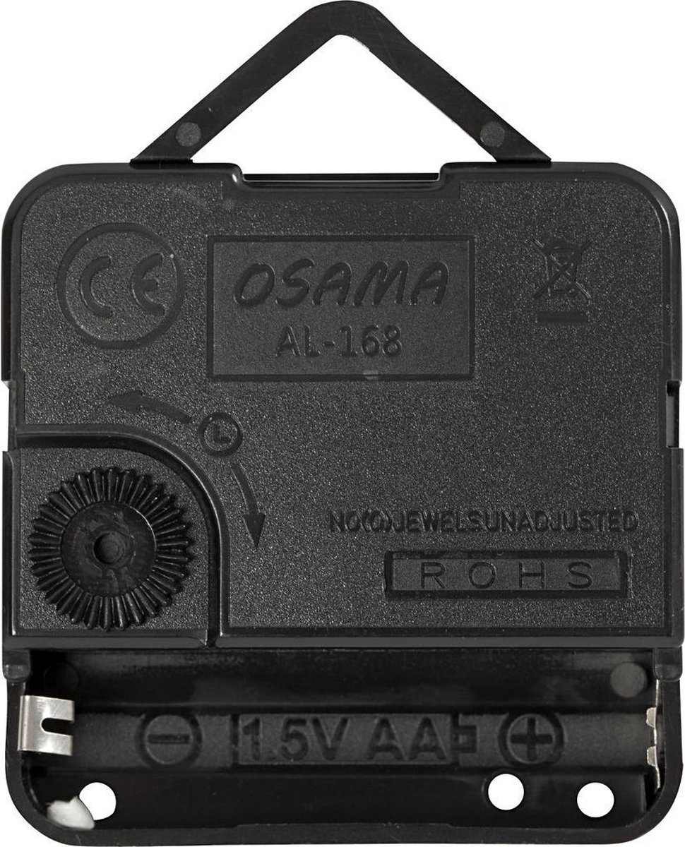 Uurwerken op batterijen met zwarte wijzers. RoHS gecertificeerd. Kan in een plaat van max 10 mm dikte gemonteerd worden. 1x AA batterij nodig (niet inclusief) Kleine wijzer is 8 cm lang, grote wijzer is 11 cm. Secondewijzer is 12 cm lang. Uurwerk is.