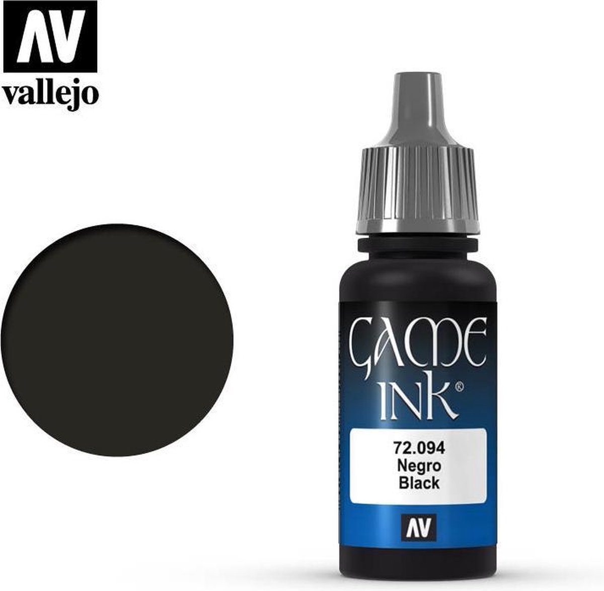Vallejo Game Ink Black (72094) is een pigmentrijke acrylverf met een zwarte kleur in een handig 17ml. eyedropper flesje dat deel uitmaakt van de Vallejo Game Color serie.