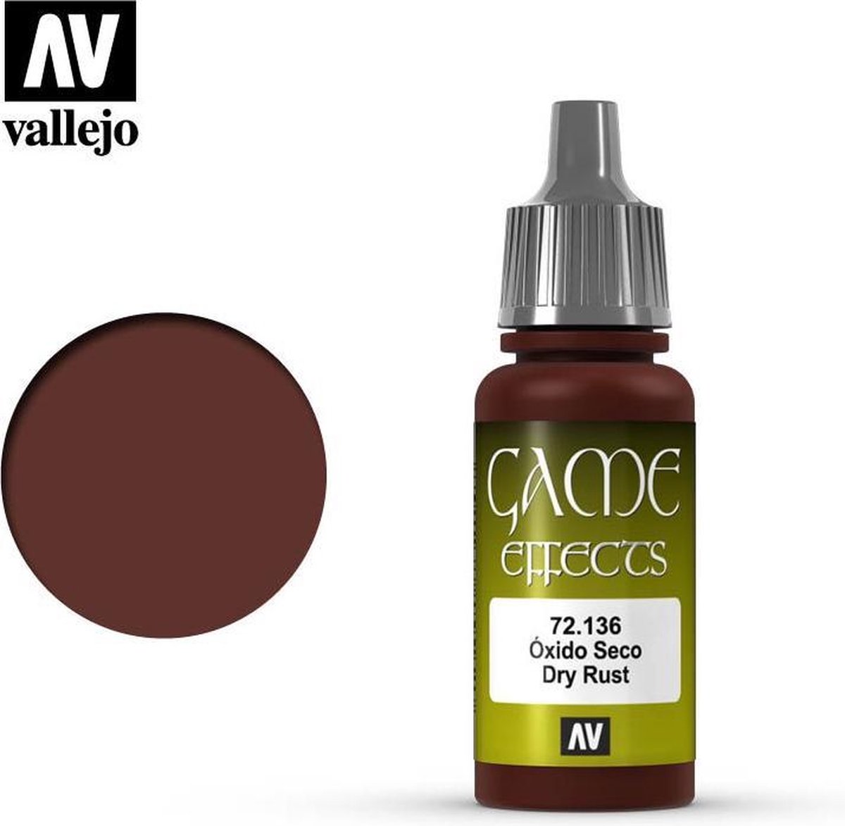 Vallejo Game Effects Dry Rust maakt deel uit van het Game Color programma van het merk Vallejo en is een donker roestige acrylverf in een 17ml. eyedropper potje.
