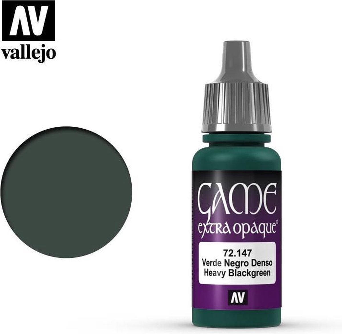 Vallejo Game Extra Opaque Heavy BlackGreen (72147) is een pigmentrijke acrylverf met een donkergroene kleur in een handig 17ml. eyedropper flesje dat deel uitmaakt van de Vallejo Game Color serie.