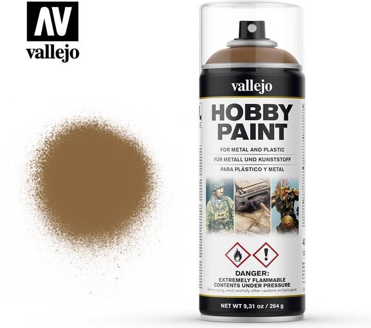 Vallejo Hobby Paint Leather Brown is een 400ml. spuitbus met bruine grondverf uit de Vallejo Hobby Paint serie die mat opdroogt en zelfnivellerend werkt. Het is speciaal ontwikkeld om te hechten op metaal, plastic en resin figuren en modellen. Het fijne pigment helpt de kleinste details te laten zien.