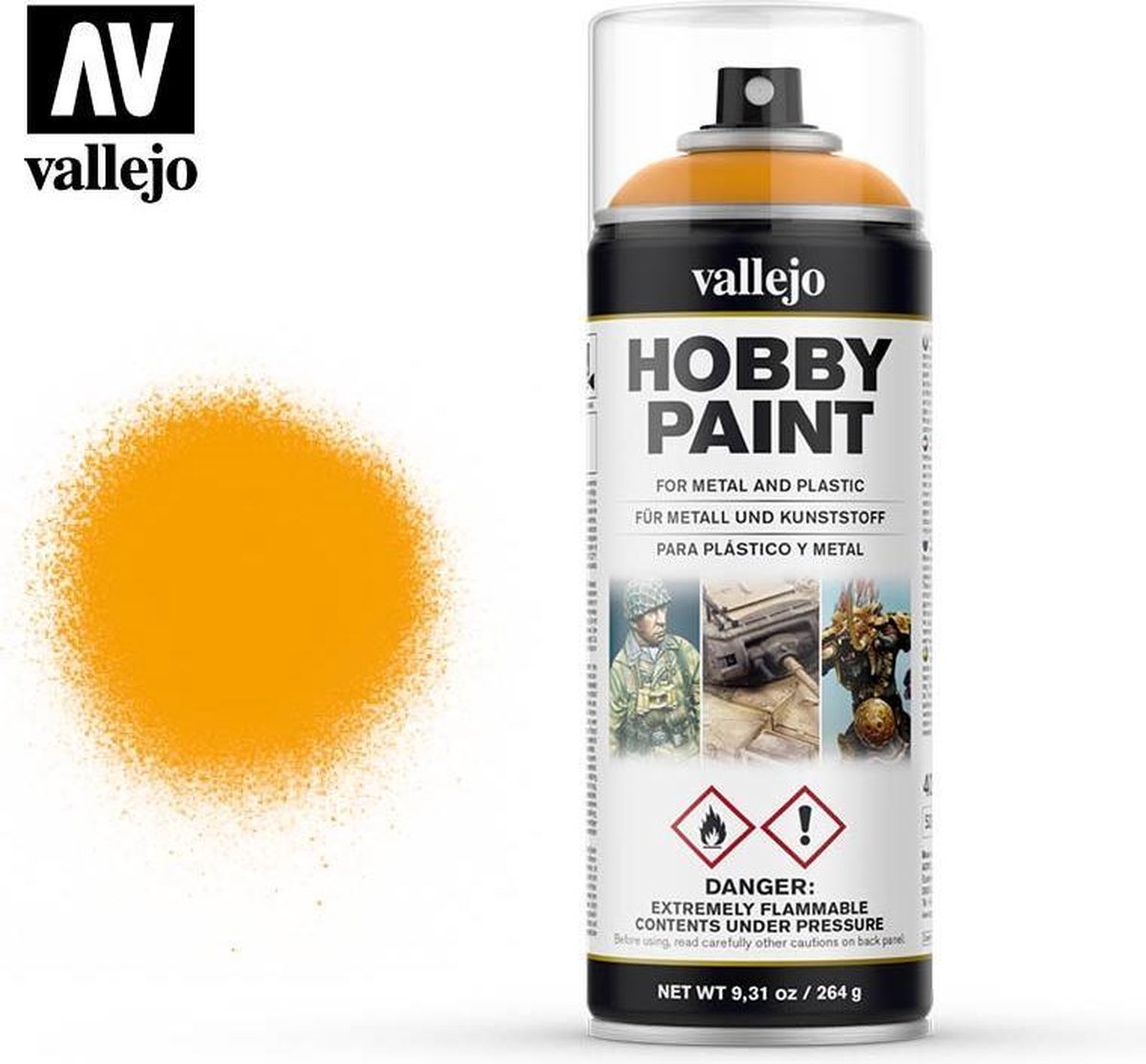 Vallejo Hobby Paint Sun Yellow is een 400ml. spuitbus met gele grondverf uit de Vallejo Hobby Paint serie die mat opdroogt en zelfnivellerend werkt. Het is speciaal ontwikkeld om te hechten op metaal, plastic en resin figuren en modellen. Het fijne pigment helpt de kleinste details te laten zien.