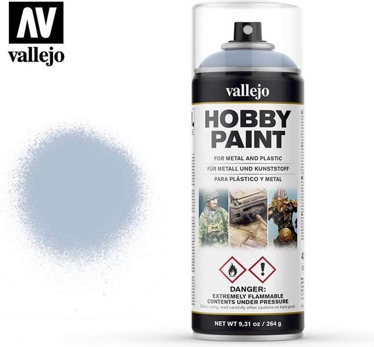 Vallejo Hobby Paint Wolf Grey is een 400ml. spuitbus met grijsblauwe grondverf uit de Vallejo Hobby Paint serie die mat opdroogt en zelfnivellerend werkt. Het is speciaal ontwikkeld om te hechten op metaal, plastic en resin figuren en modellen. Het fijne pigment helpt de kleinste details te laten zien.