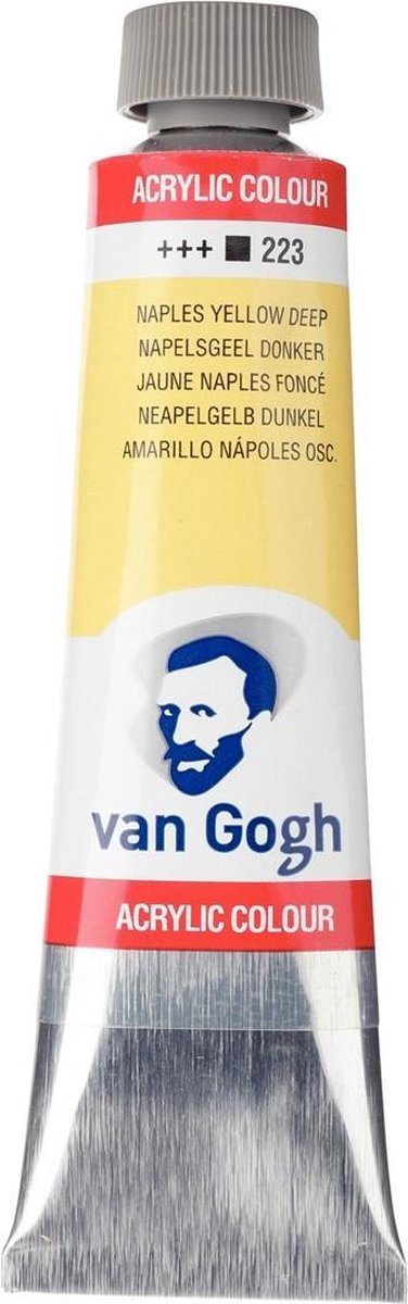 De acrylverf van Van Gogh wordt gemaakt met hoogwaardige pigmenten naar strenge Nederlandse kwaliteitsnormen. Deze acrylverf is geschikt voor de kunstenaar in opleiding en kan rechtstreeks uit de metalen tube of verdund met water worden gebruikt. Doordat de verf snel droogt, is het makkelijk om snel laag over laag te werken. Dankzij een hoog pigmentaandeel is deze dikkere verf krachtig en intens gekleurd; ideaal om met een penseel of paletmes te worden aangebracht. Van Gogh acrylverf is verkrijgbaar in 40 kleuren. Deze tube van 40 ml met Napelsgeel donker 223 is samengesteld met PW6/PBr24/PY154-pigment(en) en heeft een lichtechtheidsgraad van +++ (100+ jaar onder museumomstandigheden).