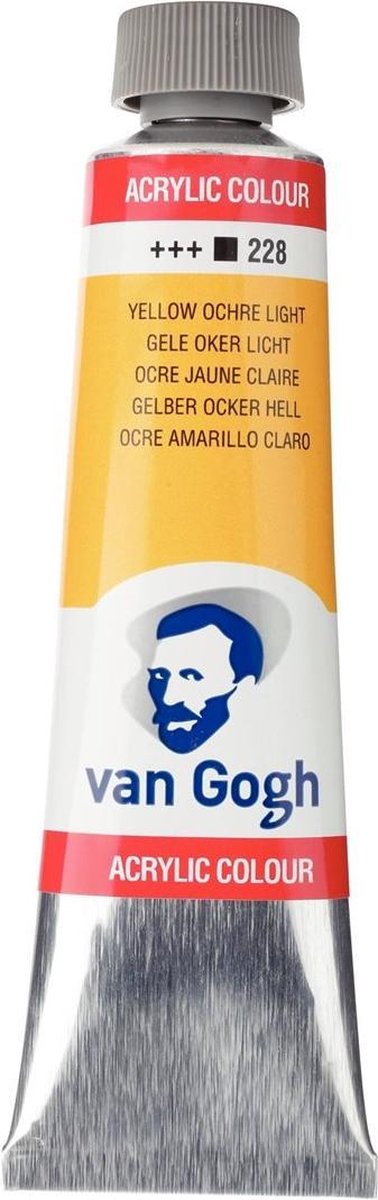 De acrylverf van Van Gogh wordt gemaakt met hoogwaardige pigmenten naar strenge Nederlandse kwaliteitsnormen. Deze acrylverf is geschikt voor de kunstenaar in opleiding en kan rechtstreeks uit de metalen tube of verdund met water worden gebruikt. Doordat de verf snel droogt, is het makkelijk om snel laag over laag te werken. Dankzij een hoog pigmentaandeel is deze dikkere verf krachtig en intens gekleurd; ideaal om met een penseel of paletmes te worden aangebracht. Van Gogh acrylverf is verkrijgbaar in 40 kleuren. Deze tube van 40 ml met Gele oker licht 228 is samengesteld met PBr24-pigment(en) en heeft een lichtechtheidsgraad van +++ (100+ jaar onder museumomstandigheden).