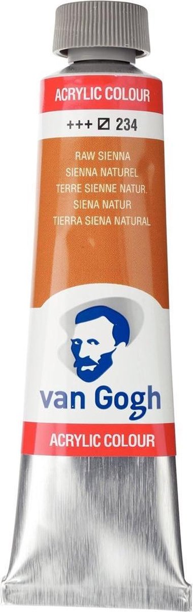 De acrylverf van Van Gogh wordt gemaakt met hoogwaardige pigmenten naar strenge Nederlandse kwaliteitsnormen. Deze acrylverf is geschikt voor de kunstenaar in opleiding en kan rechtstreeks uit de metalen tube of verdund met water worden gebruikt. Doordat de verf snel droogt, is het makkelijk om snel laag over laag te werken. Dankzij een hoog pigmentaandeel is deze dikkere verf krachtig en intens gekleurd; ideaal om met een penseel of paletmes te worden aangebracht. Van Gogh acrylverf is verkrijgbaar in 40 kleuren. Deze tube van 40 ml met Sienna naturel 234 is samengesteld met PY42-pigment(en) en heeft een lichtechtheidsgraad van +++ (100+ jaar onder museumomstandigheden).