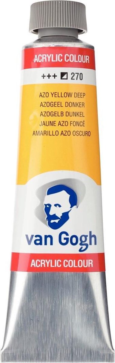 De acrylverf van Van Gogh wordt gemaakt met hoogwaardige pigmenten naar strenge Nederlandse kwaliteitsnormen. Deze acrylverf is geschikt voor de kunstenaar in opleiding en kan rechtstreeks uit de metalen tube of verdund met water worden gebruikt. Doordat de verf snel droogt, is het makkelijk om snel laag over laag te werken. Dankzij een hoog pigmentaandeel is deze dikkere verf krachtig en intens gekleurd; ideaal om met een penseel of paletmes te worden aangebracht. Van Gogh acrylverf is verkrijgbaar in 40 kleuren. Deze tube van 40 ml met Azogeel donker 270 is samengesteld met PY74/PO43-pigment(en) en heeft een lichtechtheidsgraad van +++ (100+ jaar onder museumomstandigheden).