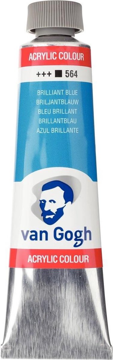 De acrylverf van Van Gogh wordt gemaakt met hoogwaardige pigmenten naar strenge Nederlandse kwaliteitsnormen. Deze acrylverf is geschikt voor de kunstenaar in opleiding en kan rechtstreeks uit de metalen tube of verdund met water worden gebruikt. Doordat de verf snel droogt, is het makkelijk om snel laag over laag te werken. Dankzij een hoog pigmentaandeel is deze dikkere verf krachtig en intens gekleurd; ideaal om met een penseel of paletmes te worden aangebracht. Van Gogh acrylverf is verkrijgbaar in 40 kleuren. Deze tube van 40 ml met Briljantblauw 564 is samengesteld met PB15/PG7/PW6-pigment(en) en heeft een lichtechtheidsgraad van +++ (100+ jaar onder museumomstandigheden).
