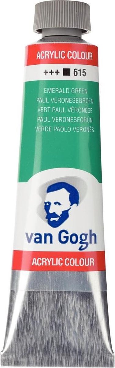 De acrylverf van Van Gogh wordt gemaakt met hoogwaardige pigmenten naar strenge Nederlandse kwaliteitsnormen. Deze acrylverf is geschikt voor de kunstenaar in opleiding en kan rechtstreeks uit de metalen tube of verdund met water worden gebruikt. Doordat de verf snel droogt, is het makkelijk om snel laag over laag te werken. Dankzij een hoog pigmentaandeel is deze dikkere verf krachtig en intens gekleurd; ideaal om met een penseel of paletmes te worden aangebracht. Van Gogh acrylverf is verkrijgbaar in 40 kleuren. Deze tube van 40 ml met Paul Veronesegroen 615 is samengesteld met PG7/PY74/PW6-pigment(en) en heeft een lichtechtheidsgraad van +++ (100+ jaar onder museumomstandigheden).
