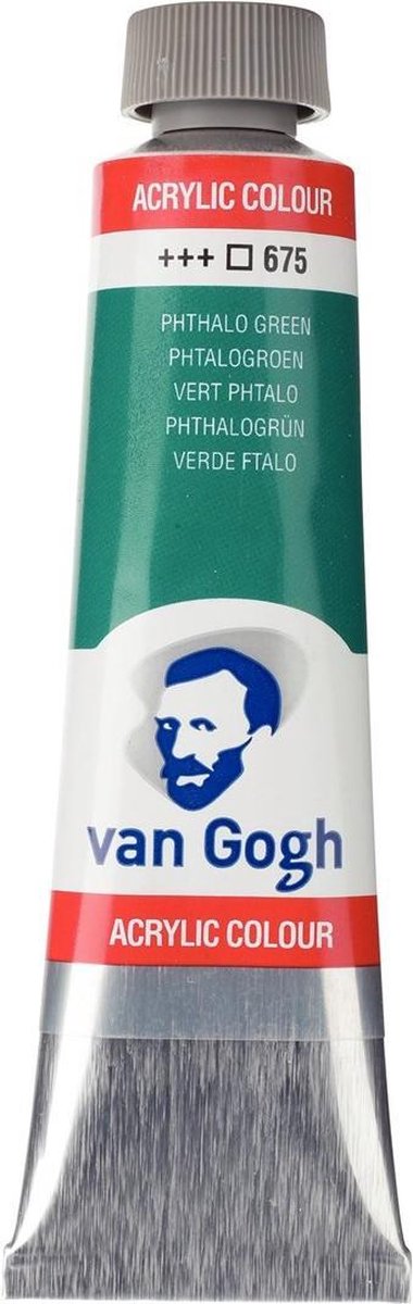 De acrylverf van Van Gogh wordt gemaakt met hoogwaardige pigmenten naar strenge Nederlandse kwaliteitsnormen. Deze acrylverf is geschikt voor de kunstenaar in opleiding en kan rechtstreeks uit de metalen tube of verdund met water worden gebruikt. Doordat de verf snel droogt, is het makkelijk om snel laag over laag te werken. Dankzij een hoog pigmentaandeel is deze dikkere verf krachtig en intens gekleurd; ideaal om met een penseel of paletmes te worden aangebracht. Van Gogh acrylverf is verkrijgbaar in 40 kleuren. Deze tube van 40 ml met Phtalogroen 675 is samengesteld met PG7-pigment(en) en heeft een lichtechtheidsgraad van +++ (100+ jaar onder museumomstandigheden).
