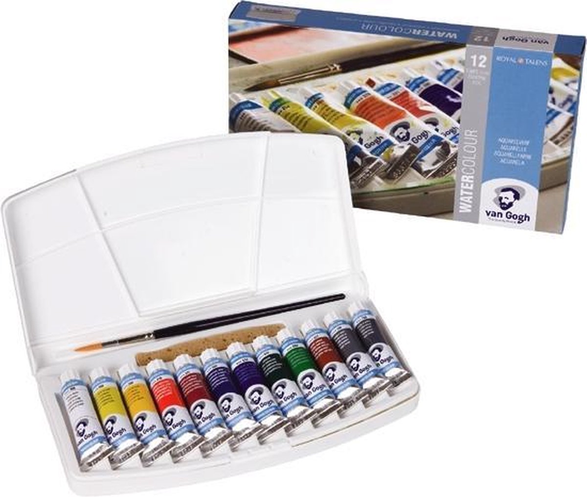 Praktische set Van Gogh aquarelverf met 12 tubes 10 ml, penseel, sponsje en mengschaal. De krachtige, transparante kleuren zijn onderling mengbaar en uitstekend lichtecht. Het deksel is verdeeld in vakjes, zodat je verschillende kleuren kunt mengen zonder dat ze door elkaar heen lopen. Na gebruik kun je het deksel makkelijk losmaken en afspoelen.