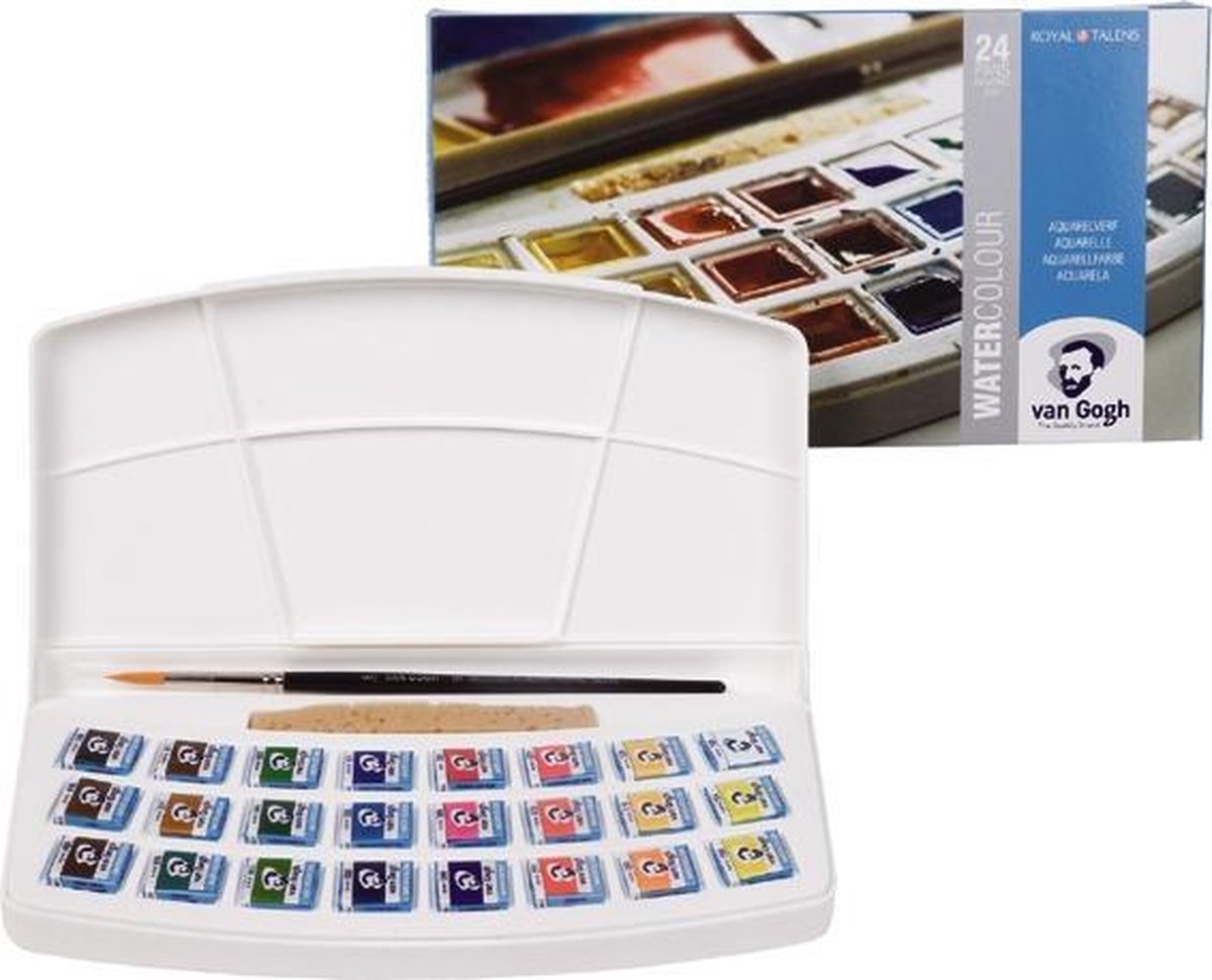 Een prachtige set met maar liefst 24 napjes Van Gogh aquarelverf. Praktisch voor thuis, maar ook ideaal voor op reis, naar school of als je buiten wilt schilderen. Je hoeft de napjes waterverf alleen maar iets nat te maken en je kunt al aan de slag. De napjes geven makkelijk kleur af. Het deksel is verdeeld in vakjes, zodat je verschillende kleuren kunt mengen zonder dat ze door elkaar heen lopen. Na gebruik kun je het deksel makkelijk losmaken en afspoelen. De krachtige, transparante kleuren zijn onderling mengbaar en uitstekend lichtecht. Alle napjes zijn ook los verkrijgbaar, dus je kunt kleuren die op zijn, makkelijk vervangen. Kleuren: 254 perm. citroengeel 268 azogeel licht 238 gummigut 270 azogeel donker 266 permanent oranje 311 vermiljoen 370 permanent rood licht 371 permanent rood donker 331 kraplak donker - 366 quinacridonerose 506 ultramarijn donker 512 Kobaltblauw (ultram.) 508 Pruisisch blauw 535 ceruleumblauw (phtalo) 623 sapgroen - 662 permanent groen 645 Hookersgroen