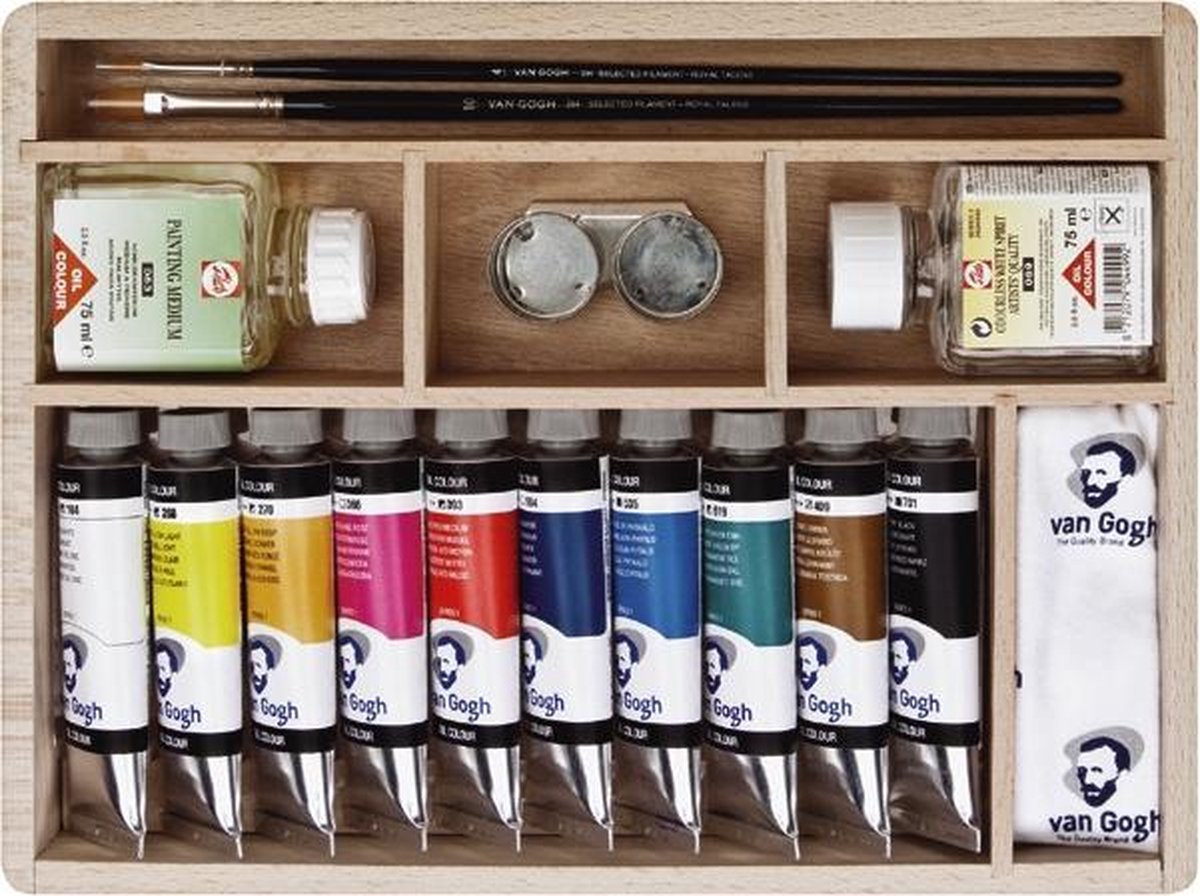 Van Gogh olieverf; pasteuze olieverf voor een prachtig resultaat - krachtige briljante kleuren - hoog pigmentgehalte en een uniforme droogtijd en glansgraad. Fraaie houten kist met 10 tubes 40 ml Van Gogh olieverf met de kleurnummers: 105 - 268 - 270 - 393 - 366 - 504 - 535 - 619 - 409 - 701, 75 ml schildermedium, 75 ml reukloze terpentine, Van Gogh Gussow penseel 294 nr 10, Van Gogh rond penseel 295 nr 6, dubbele paletdop, houten palet en reinigingsdoekje.