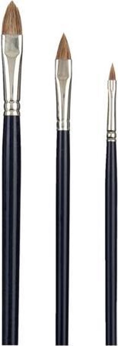 Kattentong penselen met runderoren haar voor dikkere verfsoorten zoals olie- en acrylverf, voor verfsoorten die sterk verdund worden zoals aquarelverf Haar: runderoren haar Vorm: kattentong Huls: afgeplat, naadloos vernikkeld messing Steel: lang, glanzend gelakt Karakteristieken: slijtvaste , veerkrachtige haarbundel geeft een gepunt aangezette, strakke toets
