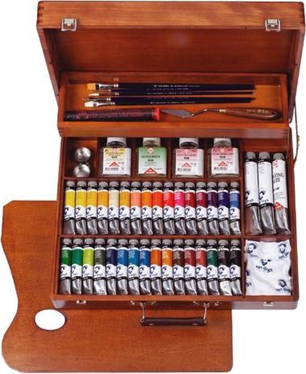 Een fantastische olieverfkist van Van Gogh met een zorgvuldig samengesteld kleurassortiment Van Gogh olieverf met maar liefst 32 kleuren in 20 ml tubes, en 2 kleuren wit in 60 ml tubes. De kist is zeer luxe uitgevoerd, gemaakt van een prachtige kwaliteit hout en voorzien van een stevig handvat. In het langwerpige vak van de schilderkist bevinden zich diverse kwalitatief hoogwaardige Van Gogh penselen van verschillende haarsoorten; stugge penselen van varkenshaar voor een zichtbare penseelstreek, maar ook penselen van runderorenhaar en polyestervezel voor het aanbrengen van bijvoorbeeld uiterst gladde glacislagen. Natuurlijk vind je in deze fantastische kist ook allerlei andere accessoires zoals een schildersmes, dubbele paletdop en flacons met terpentine, medium en vernis. Een fantastische schilderkist voor de veeleisende kunstschilder. Dankzij het hoge pigmentgehalte zijn de Van Gogh kleuren krachtig en briljant. Ze zijn makkelijk te mengen en de verf is bijzonder prettig om mee te