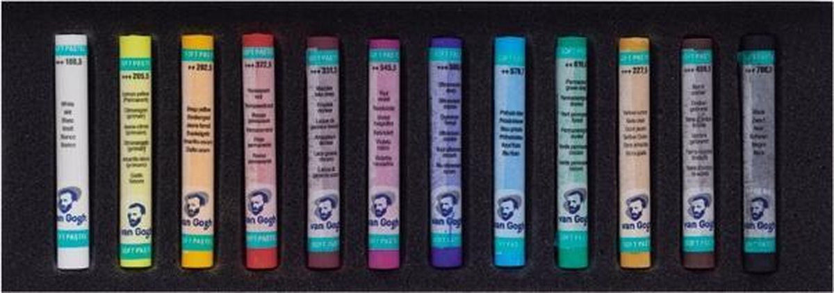 Praktische starterset met 12 prachtige kleuren softpastels van Van Gogh. De pastels zijn heel zacht, maar toch voldoende stevig zodat ze niet snel zullen afbrokkelen. Ze hebben een slanke vorm waardoor ze heel geschikt zijn voor detailwerk, maar als je ze plat neerlegt kan je er ook makkelijk grotere vlakken mee vullen. De kleuren zijn zeer lichtecht waardoor je kunstwerk jarenlang mooi blijft. De pastels hebben een zeer goede kleurafgifte en kan je moeiteloos op verschillende ondergronden gebruiken, zoals papier, karton, steen, asfalt en hout.