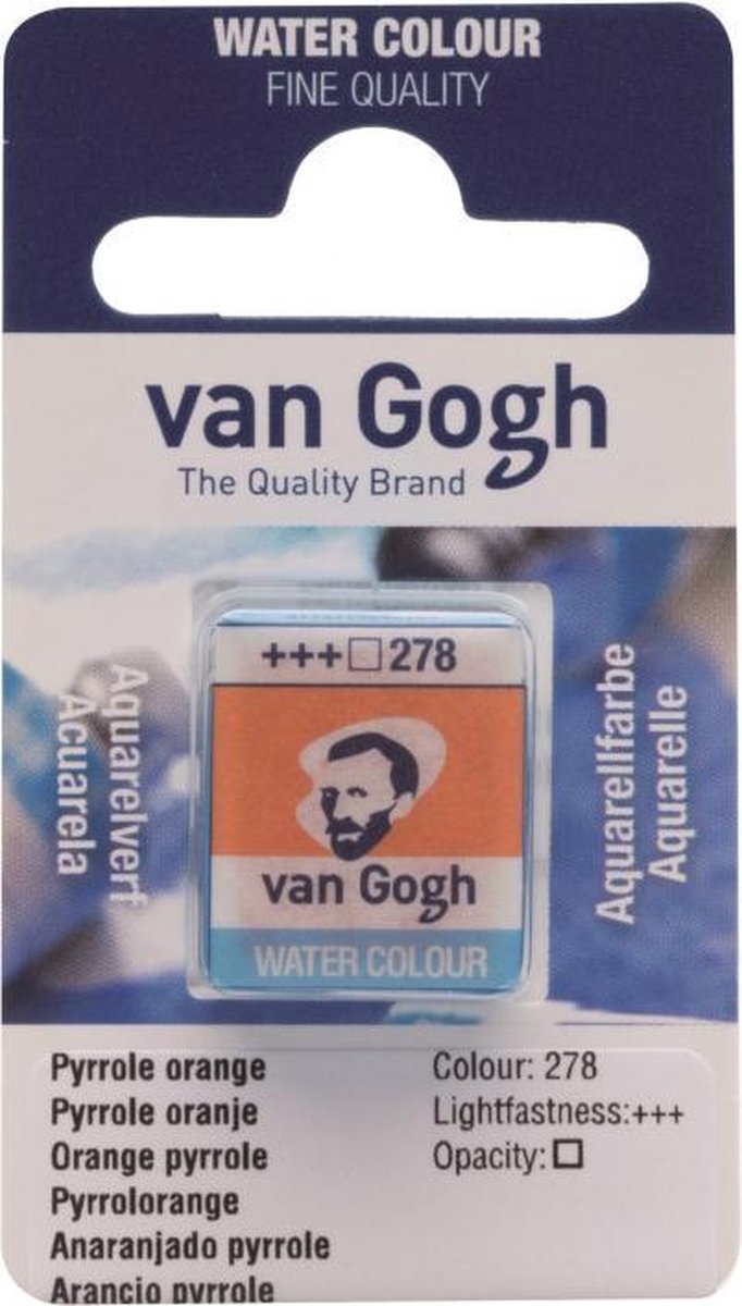 Van Gogh aquarelverf is een verf met een hoge kleurkracht. Alle kleuren hebben een hoge graad van lichtechtheid. De kleuren zijn door de zuiverheid van de verf gemakkelijk te mengen. Met veel water en de juiste penselen kun je de kleuren mengen en mooie verwassingen maken met levendige kleuren. De verf zit in een kunststof blokje en kan los gebruikt worden, maar past ook in de lege opbergdozen. Het assortiment is sinds kort uitgebreid en bestaat nu uit 72 kleuren. Van 11 kleuren is de receptuur verbeterd.