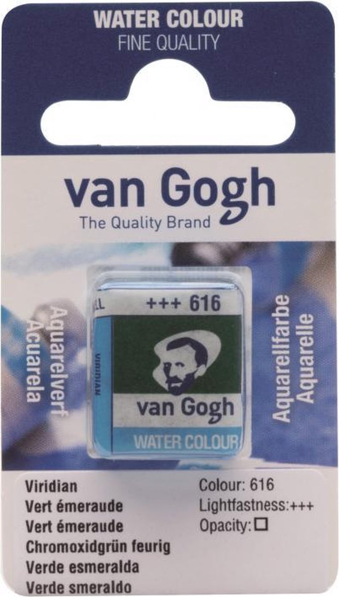 Van Gogh aquarelverf is een verf met een hoge kleurkracht. Alle kleuren hebben een hoge graad van lichtechtheid. De kleuren zijn door de zuiverheid van de verf gemakkelijk te mengen. Met veel water en de juiste penselen kun je de kleuren mengen en mooie verwassingen maken met levendige kleuren. De verf zit in een kunststof blokje en kan los gebruikt worden, maar past ook in de lege opbergdozen. Het assortiment is sinds kort uitgebreid en bestaat nu uit 72 kleuren. Van 11 kleuren is de receptuur verbeterd.