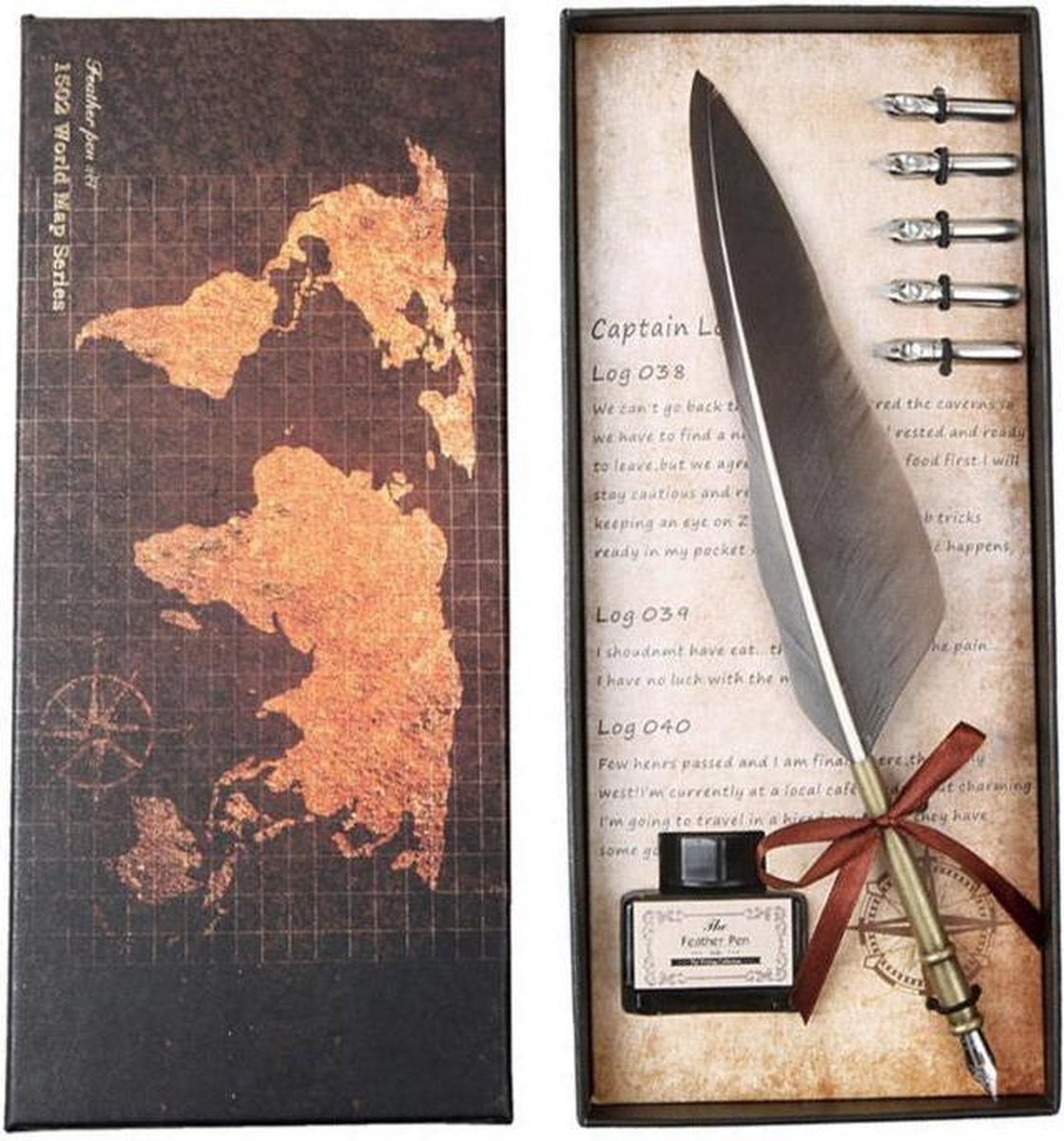 Prachtige veren kroontjespen set met inktflacon en 5 kroontjes in verschillende diktes. Heel fraai vormgegeven, in een vintage designlook. Uit de 1502 World Map Series, echt een schitterend cadeau! Binnen 2/3 werkdagen in huis, pakket past niet door de brievenbus dus wordt in een doosje verstuurd. Writing Girl is de leukste webshop met de fijne schrijfaccessoires en handige kantoorartikelen waar je blij van wordt. Writing Girl krijgt de leukste nieuwe items binnen en geweldig nieuwe merken uit Italië, Zweden, Noorwegen en Duitsland. Check onze website iedere week voor nieuwe artikelen die te gek en handig zijn voor je werk en je inspiratie geven! Wij maken van iedere verpakking een feestje: we pakken je bestelling mooi in een prachtige doos met een klein cadeautje van ons – want we willen je met iedere levering van Writing Girl ontzettend blij maken en een goed gevoel geven! Bestellingen worden gratis verzonden, binnen twee (werk)dagen geleverd en de producten worden mooi ingepakt