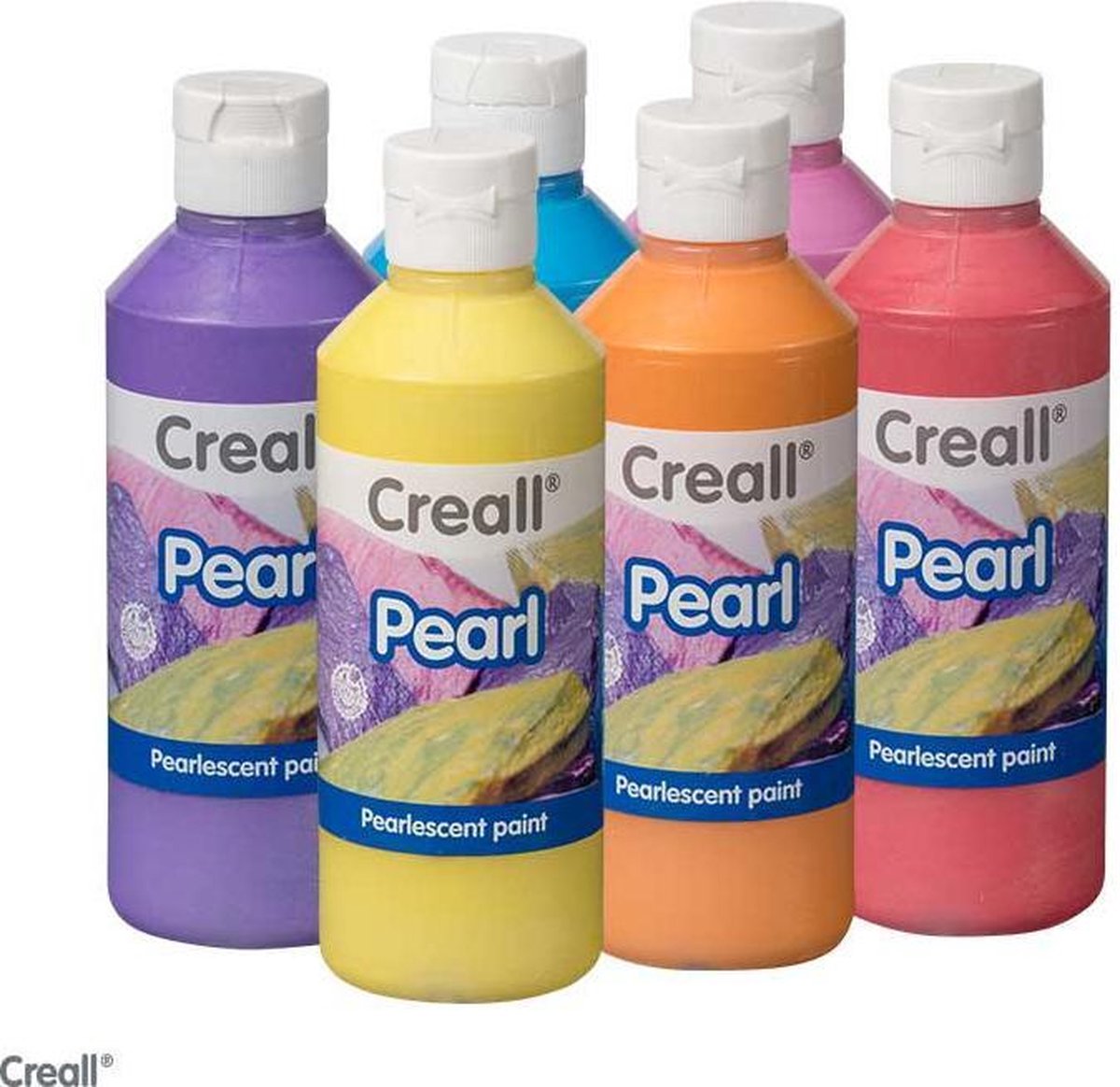 * Waterbestendige parelmoerverf. * Gebruiksklaar. * Bijzondere kleureffecten. * Na droging zijdeglans. * Mooie effecten op ronde voorwerpen. * Voor stempel-, druk-, kras- en vouwtechniek. * Vermengd met Creall-sticker medium ontstaat een soort sticker. * Doos met 6 flessen assorti: roze, blauw, geel, paars, rood en oranje.