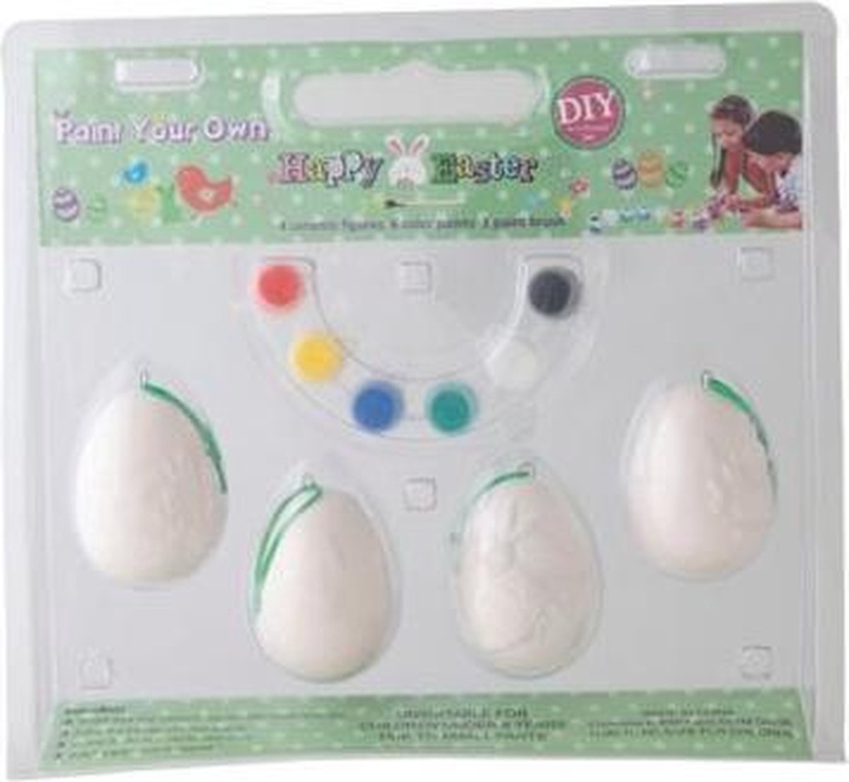 In de aanloop naar Pasen of leuk om met Pasen zelf te doen; je eigen Paasei schilderen! Hou de kinderen lekker bezig tijdens deze gezellige dagen in het voorjaar! De verpakking bevat 4 eieren van gips met een Paashaas afgebeeld, 2 kwastjes en 6 kleuren om je Paasei prachtig te schilderen. Wie maakt het mooiste ei?