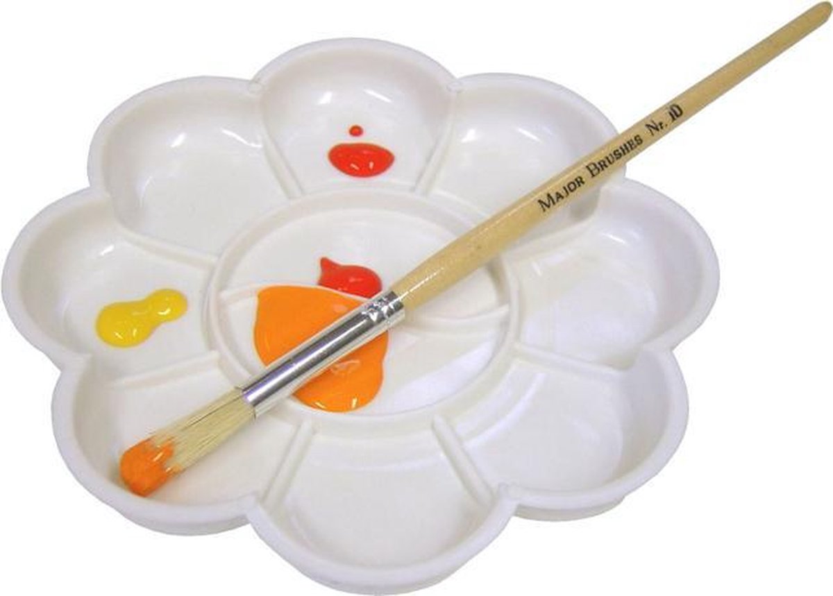 Verf Palet - Mengpalet Bloem 13 cm - 10 stuks. Kleine verf palet in de vorm van een bloem, voorzien van 8 verf/mengvakken. Kan ook gebruikt worden voor kleine knutselspullen te sorteren. Deze palet uit plastiek heeft een diameter van circa 13 cm en een diepte van 1,5 cm. Afgebeelde verf en penseel niet inbegrepen. U bekomt dus 10 stuks van deze schilderspalet. Ben je voor jouw creatieve kinderen nog op zoek naar verf, penselen, verfrollen, verfpotjes, sponsjes of sjablonen? Wij hebben het hier allemaal.