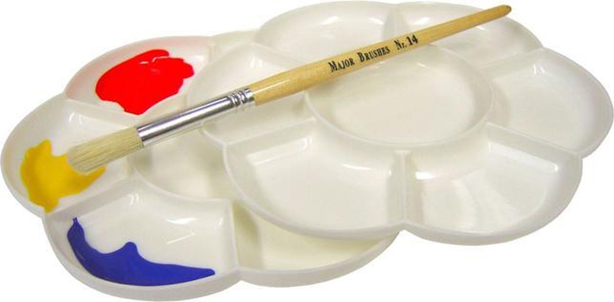 Verf Palet - Mengpalet Dubbele Bloem 17 cm - 4 stuks. Leuke dubbele verf palet in de vorm van een bloem, voorzien van 7 verf/mengvakken. Kan ook gebruikt worden voor kleine knutselspullen te sorteren of op te bergen. Deze palet uit plastiek heeft een diameter van circa 17 cm en een diepte van 1,5 cm (dicht = 3 cm). Afgebeelde verf en penseel niet inbegrepen. U bekomt dus 4 stuks van deze dubbele schilderspalet. Ben je voor jouw creatieve kinderen nog op zoek naar verf, penselen, verfrollen, verfpotjes, sponsjes of sjablonen? Wij hebben het allemaal.