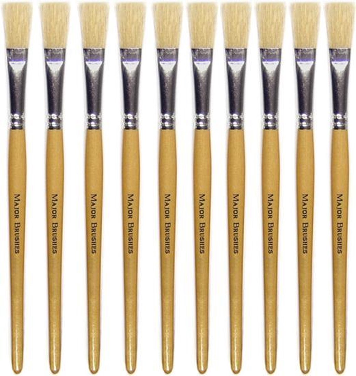 Verf Penseel Naturel Plat Nr. 12 - Set van 10 stuks. 10 platte verfkwasten (varkenshaar) voor kinderen in naturel look. Door zijn korte lengte zijn deze verf penselen of verfkwasten de perfecte verfborstel voor de jonge kunstenaars. Ze hebben een totale lengte van circa 19 cm. Prijs is voor één set van 10 stuks.