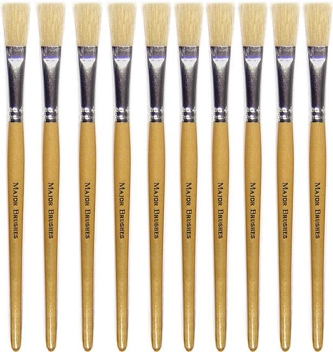 Verf Penseel Naturel Plat Nr. 18 - Set van 10 stuks. 10 platte verfkwasten (varkenshaar) voor kinderen in naturel look. Door zijn korte lengte zijn deze verf penselen of verfkwasten de perfecte verfborstel voor de jonge kunstenaars. Ze hebben een totale lengte van circa 20 cm. Prijs is voor één set van 10 stuks.