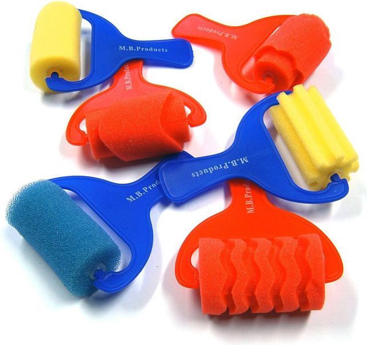 Set van 6 verfrollers met diverse motieven. De foam verfrollers zijn 7 cm breed en hebben een diameter van 4 cm, de totale lengte van de rollers (met handvat) is 13 cm. Prijs is voor één set (= 6 foam verfrollers).