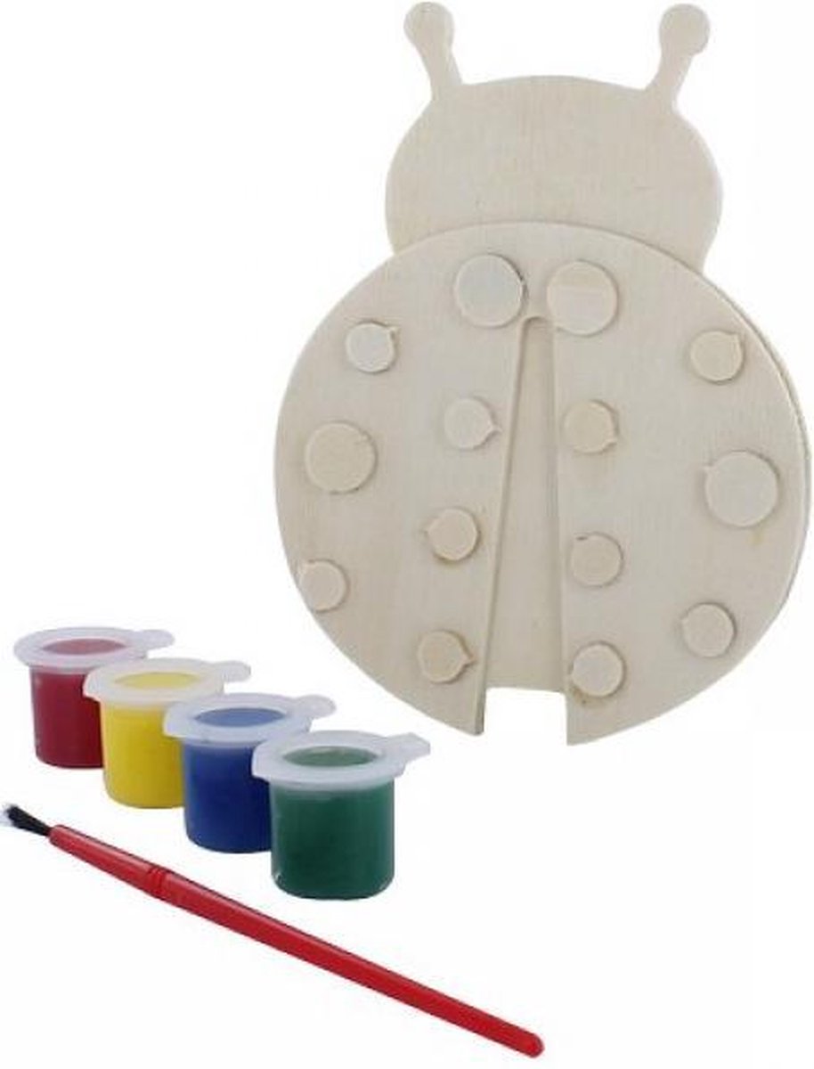 Verfset uit hout in de vorm van een lieveheersbeestje. Set inclusief 4 kleuren verf en penseel. Ideaal voor de kinderen om hen creatief bezig te houden!