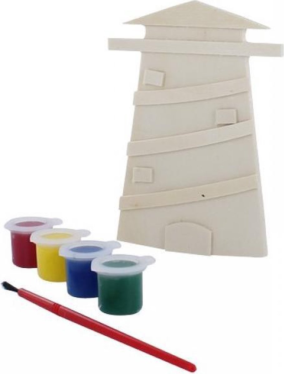 Verfset uit hout in de vorm van een vuurtoren. Set inclusief 4 kleuren verf en penseel. Ideaal voor de kinderen om hen creatief bezig te houden!