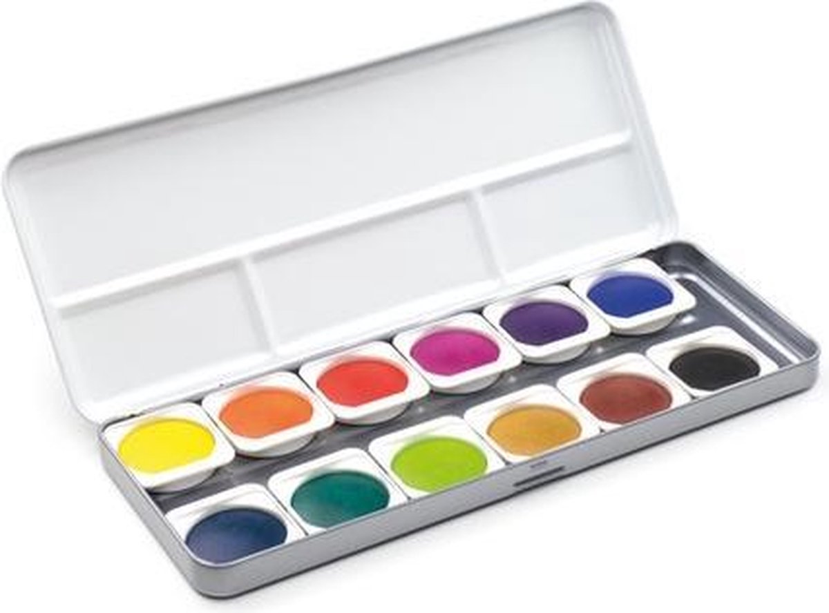 De verftabletten zijn vervaardigd van hoogwaardige pigmenten. Daardoor zijn de kleuren helder en hebben een goede dekking. Napjes zijn uitwisselbaar. Geleverd in een robuuste metalen blik. De deksel is geschikt als mengpalet en kan gemakkelijk worden gereinigd. Inhoud 12 kleuren.