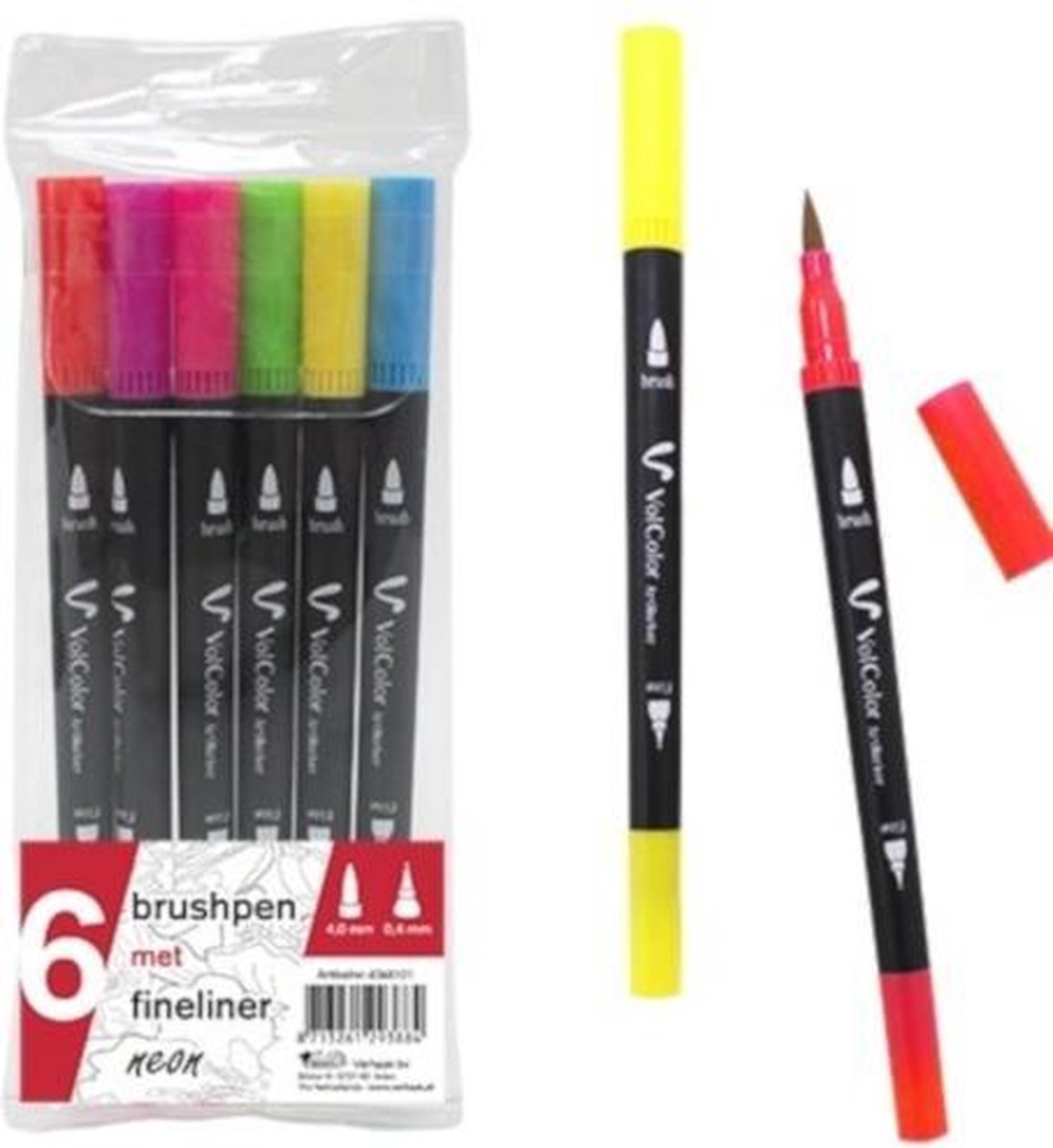 Verhaak brushpennen/fineliner Neon Een multifunctionele pennenset met aan iedere pen een brushpen en een fineliner. Met de etui kun je de pennen gemakkelijk ordenen en opbergen. Specificaties: Kleur: multicolor Materiaal: kunststof Lengte: 15 cm Puntdikte brushpen: 4,0 mm Puntdikte fineliner: 0,4 mm Inhoud: 6 Pennen 1 Etui