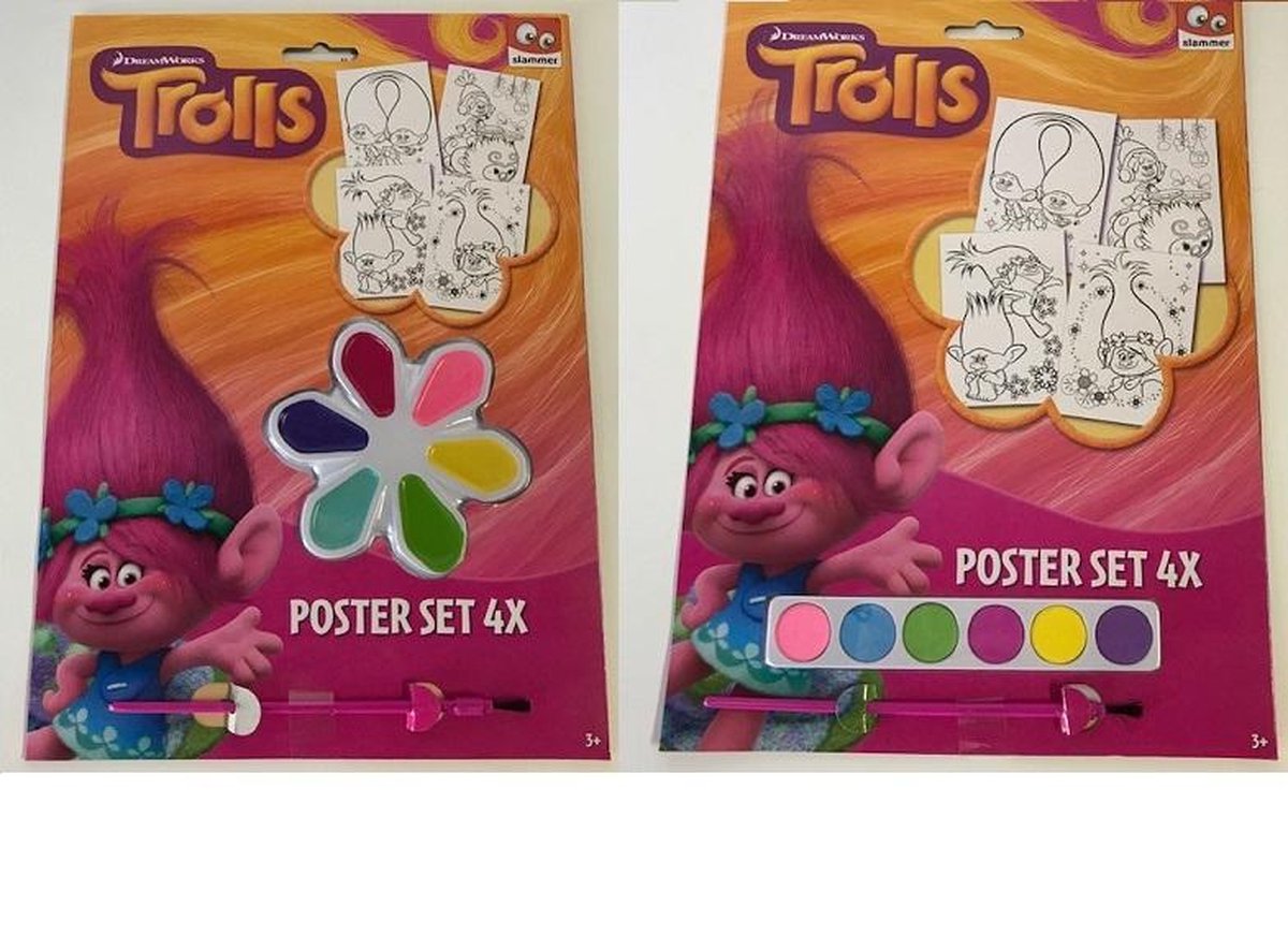 2 verschillende sets van Trolls. - 1 set van 4 tekeningen om te verven. Kwastje en 6 kleuren waterverf mee geleverd. - 1 set van 4 tekeningen om te verven. Kwastje en 6 kleuren waterverf mee geleverd.
