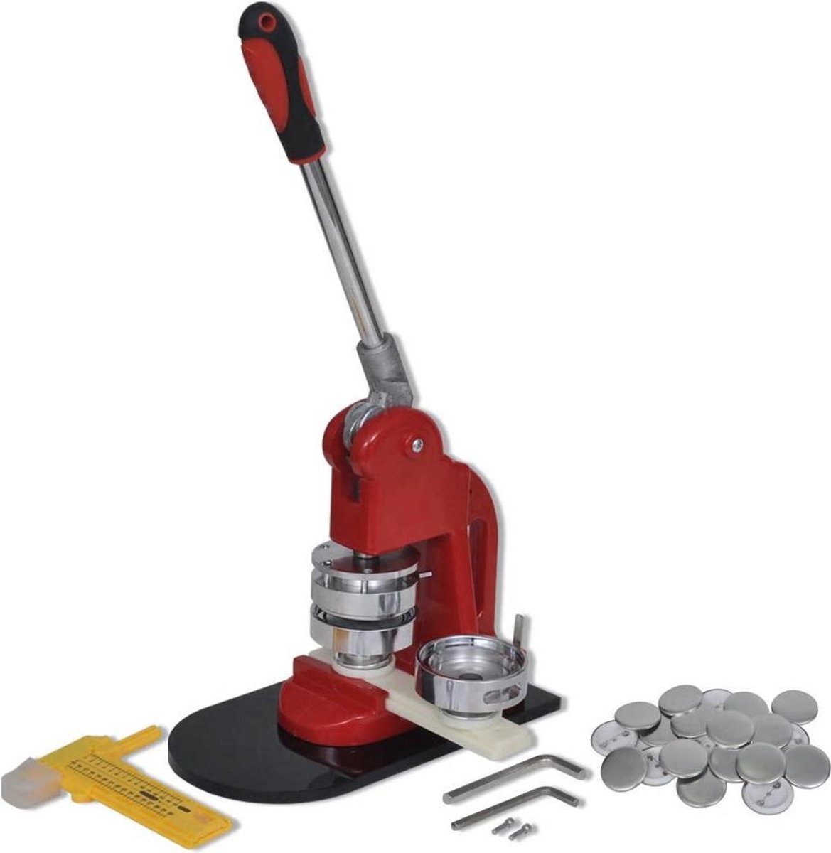 De buttonmachine is perfect voor het maken van je eigen buttons. Het ontwerp van de 'positive stop' zorgt voor de uitlijning van de bovenste en onderste mal. De zachte handgreep is gebruiksvriendelijk en vereist slechts een kleine kracht om een button te maken, waardoor de machine zeer eenvoudig te bedienen is. Met de meegeleverde 500 sets met button-onderdelen kun je heel veel eigen buttons maken. Je kan ook buttons maken bedrijfs- of evenementlogo's waardoor de set ook een ideale keuze is voor reclame- en promotiecampagnes. De kunststof achterkant maakt de buttons licht in gewicht en gemakkelijk vast te spelden. Let op, de levering bevat een buttonmachine met een 44 mm mal, een cirkelsnijder, een set montagegereedschappen en 500 sets met button-onderdelen. Buttonmachine: Materiaal: metalen behuizing en kunststof basisplaat Totale afmetingen: 19 x 10 x 45 cm (L x B x H) Grootte van de mal: 44 mm Kleur: rood Stevige malbasis Met zachte handgreep Eenvoudig in gebruik