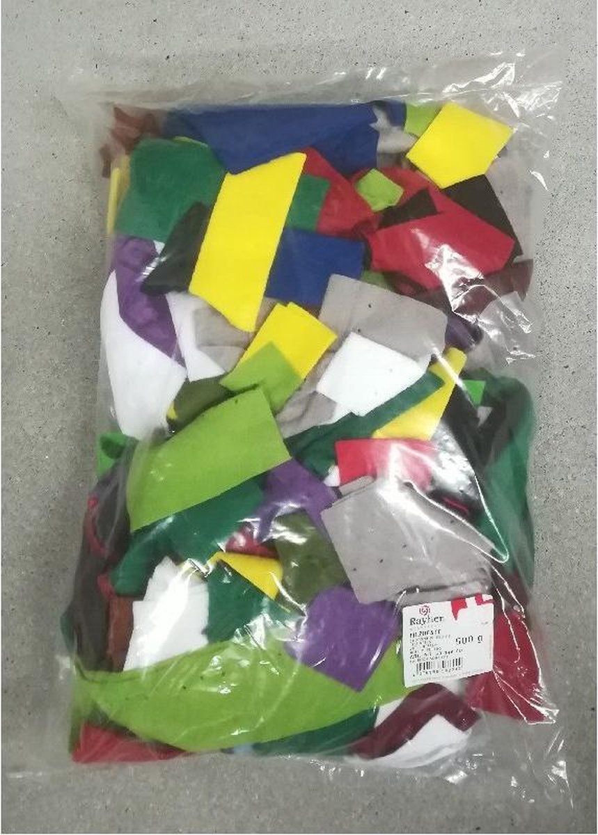 Zak vol met viltresten. Verschillende kleuren en afmetingen. Voor ieder wat wils. Geen een zak is hetzelfde. Niet geschikt voor kinderen onder de 36 maanden. Gevaar op verstikking.