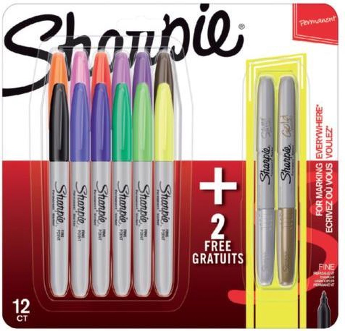 Sharpie permanente markeerstift met fijne punt om overal* te markeren. Opvallende fijne punt schrijft indrukwekkend. Sneldrogend. Inkt bestand tegen vervagen en waterafstotend. Goed voor op donkere ondergrond. *Solide ondergrond onder normale omstandigheden. blister van 12 stuks + 2 GRATIS, geassorteerde pastelkleuren + zilver en goud