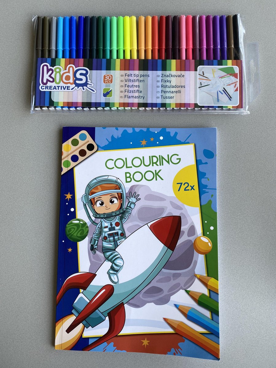 Dit zijn 30 viltstiften met allemaal een verschillende kleur en om die gelijk te kunnen gebruiken krijgt u van ons ook nog eens een kleurboek erbij! Het thema van het kleurboek is ruimtevaart en er zijn 72 verschillende kleurplaten dus genoeg om alle viltstiften te kunnen gebruiken.