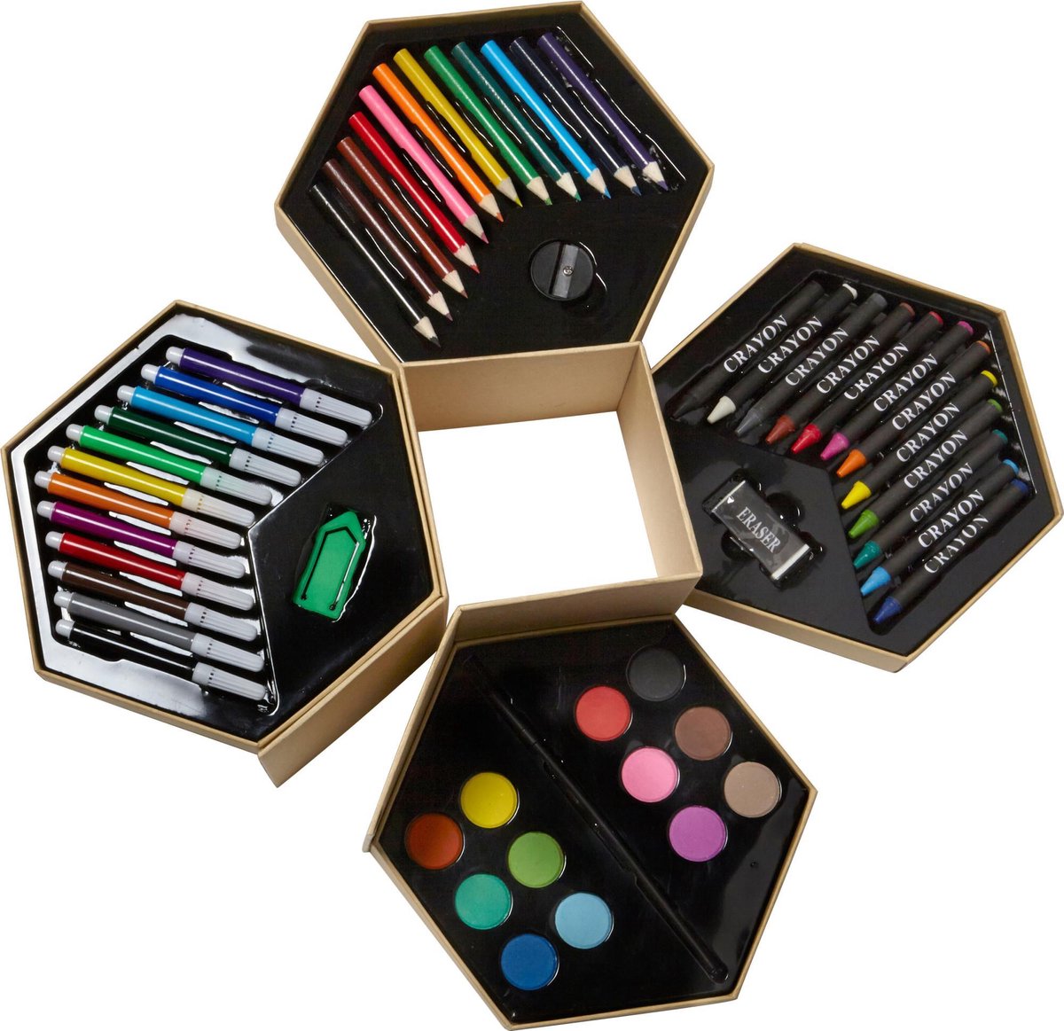 Knutselopbergdoos gevuld. In fraaie waaiervorm. met viltstiften,kleurpotloden, paperclips, puntenslijper, waskrijt, gum waterverf en penseel. 56 delige kinder tekenset Dit is een snel opgeruimd set, niet groot wel heel makkelijk en overzichtelijk. ideaal voor tussendoor snel op te ruimen en op te bergen. Speciaal voor peuter en kleuter en kinderen tot ongeveer 8 jaar. Buitenzijde is geheel Blanco, maak er een echte kleurdoos van en kleur alvast de buitenzijde! In 2 versies, bij de andere versie is de buitenzijde al geheel gekleurd.