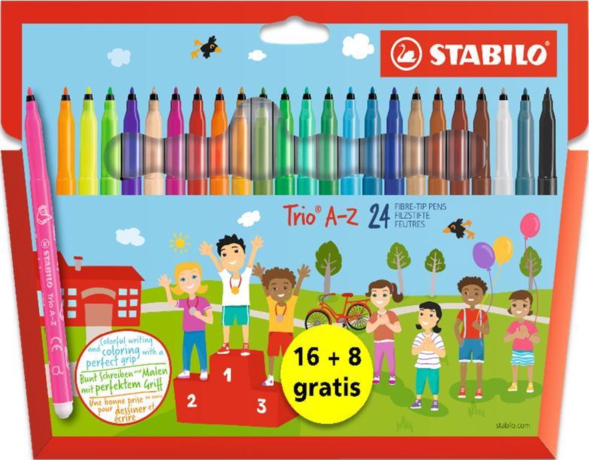 Viltstiften STABILO Trio A-Z 16+8 GRATIS De STABILO Trio producten zijn gebaseerd op het feit dat kinderen een pen of potlood met driehoekige grip, automatisch in de juiste houding vastpakken. Door het grotere gripvlak is minder druk nodig om de pen of het potlood vast te houden en de hand slipt minder makkelijk weg. Hierdoor wordt de kinderhand niet zo snel moe. Voor een goede houding, vanaf het allereerste begin. Geblokkeerde punt voor een lange levensduur. Schrijfbreedte 0,7 mm. Uitwasbare inkt.