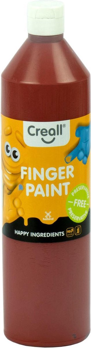 Vingerverf in de kleur BRUIN . Flacon van 750 ml. Gebruiksklaar en dekkend. Voor 98% natuurlijke ingredieenten. Waarschuwing: Gebruik door kinderen onder de 3 jaar alleen onder toezicht van een volwassenen. Kleine delen; risico in inslikken. PRESERVATIVE FREE
