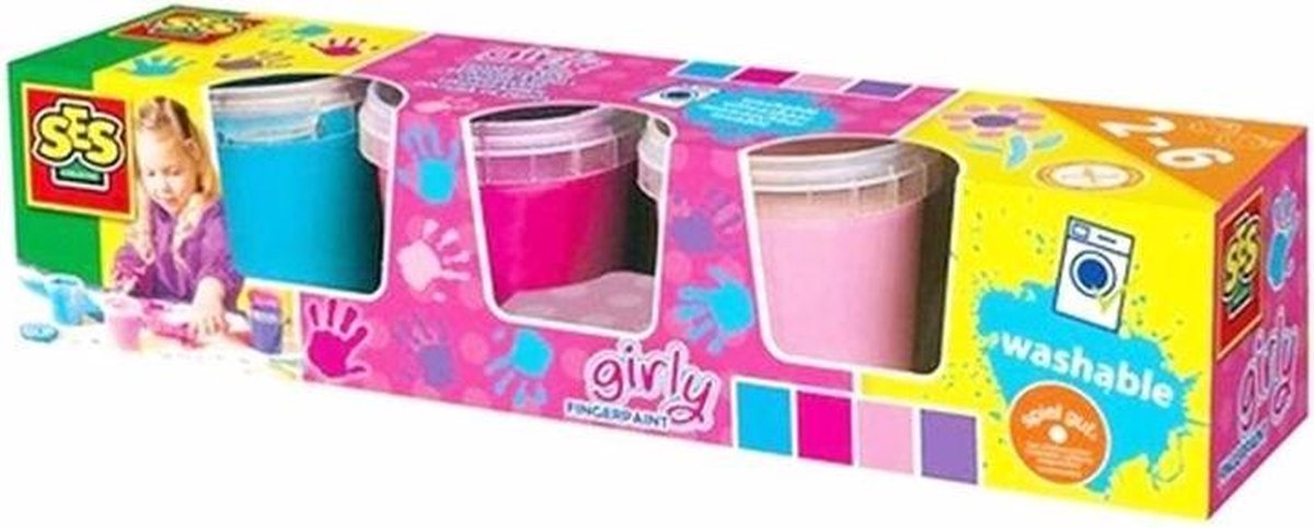 Vingerverf set 4 potjes. Deze set bevat 4 potjes vingerverf in de kleuren paars, lichtroze, fuchsia en blauw. Elke potje bevat ongeveer 150 ml verf. Vingerverf is een van de bekendste productlijnen van SES Creative. De kwaliteit, kleurintensiteit en uitwasbaarheid van de SES vingerverf maken deze onverslaanbaar. De verf is parabenenvrij, hypoallergeen en glutenvrij.