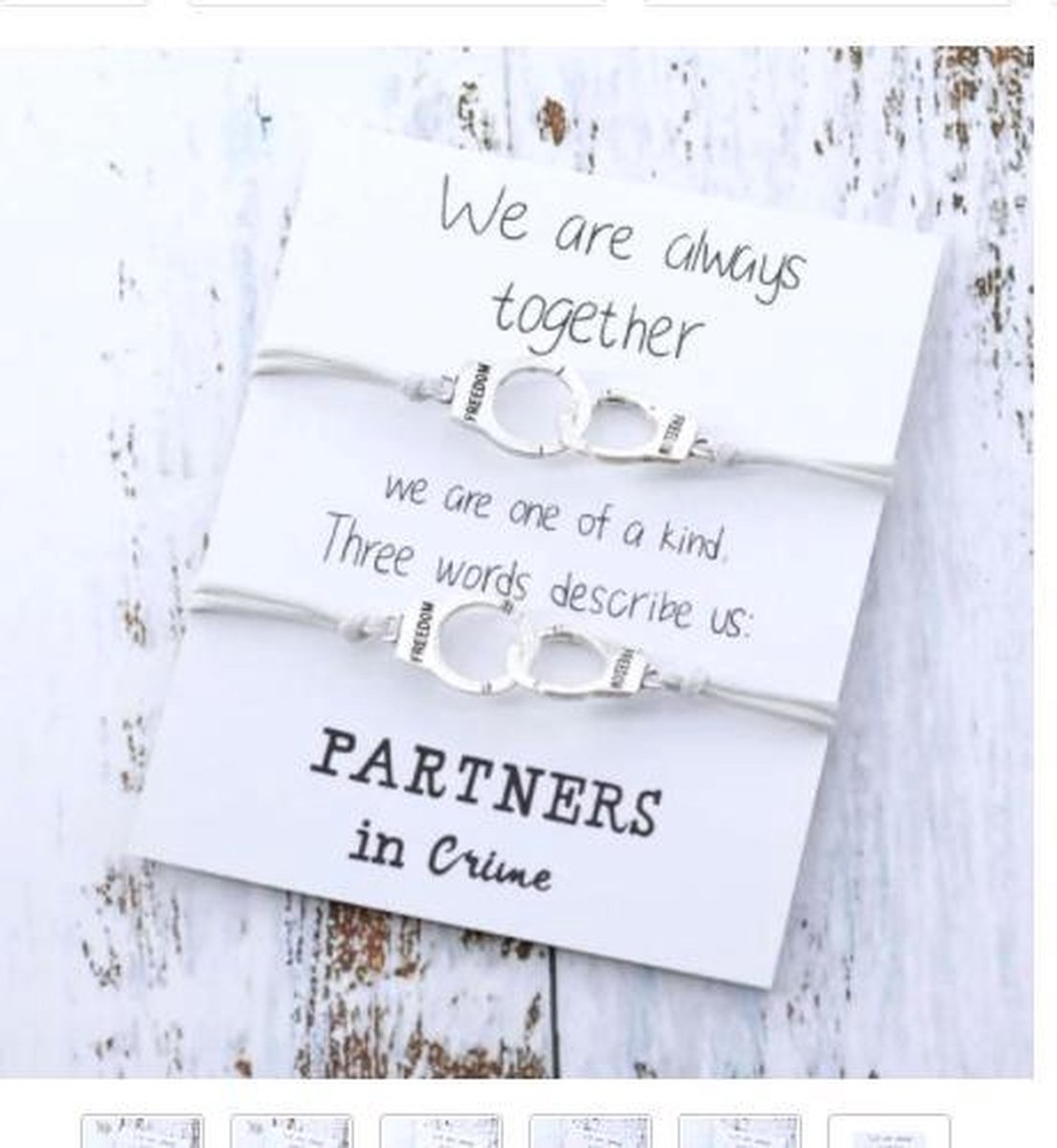 Vrienden armband: partners in crime Kleur: wit partner in crime Voor alle polsen 2 stuks Hanger: handboeien Tekst: We are always together We are one of a kind Three woeds describe us: Partners in crime